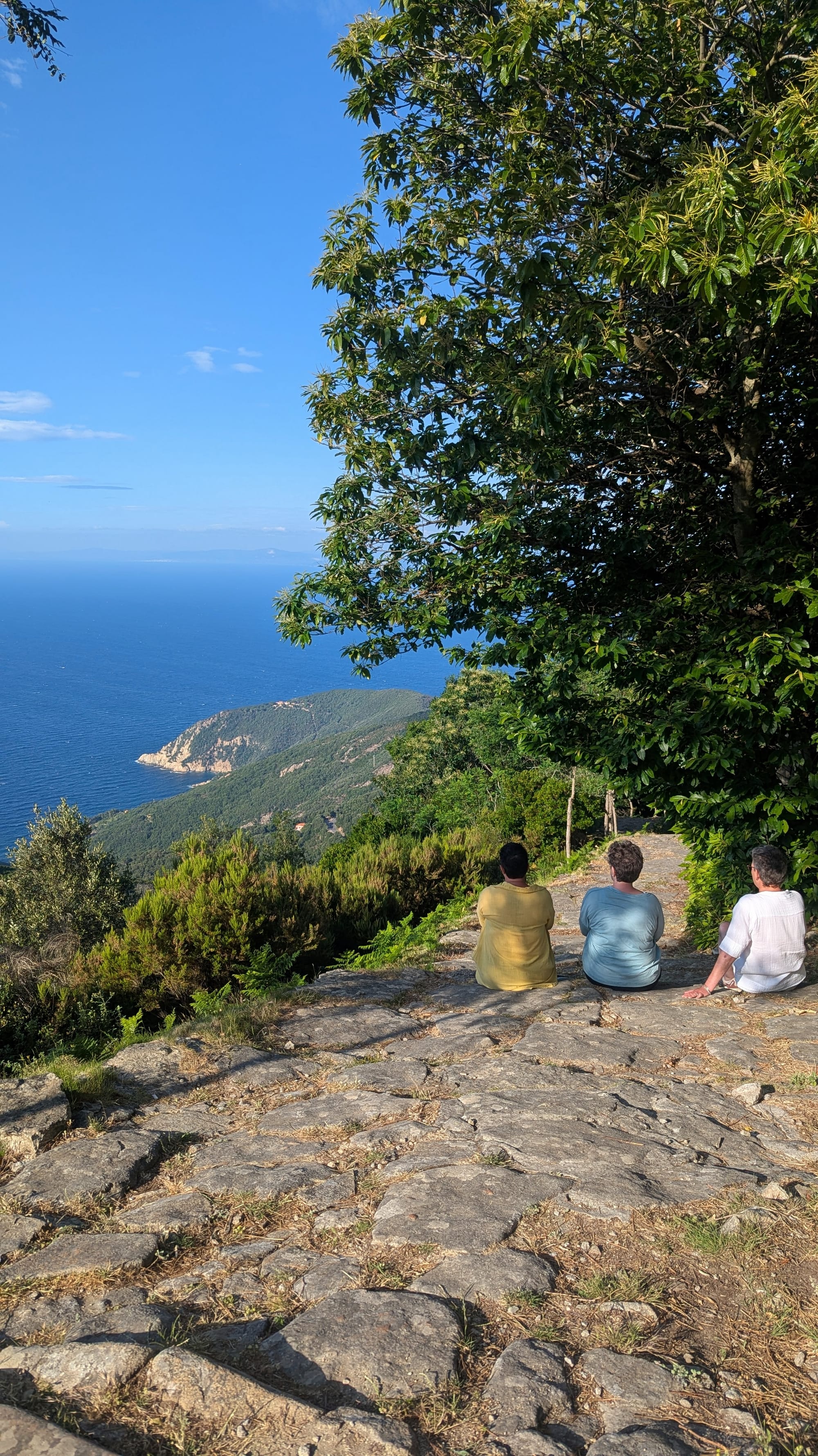We trekken onze wandelschoenen weer aan en lopen de hiking trail van Capo d'Enfola, onderdeel van het Nationaal Park van de Toscaanse Archipel. We banen ons een weg over rotsen langs kliffen door mediterraan struikgewas en komen zo op een punt dat het einde van de wereld lijkt. Een uitgestrekte zee diep onder ons.